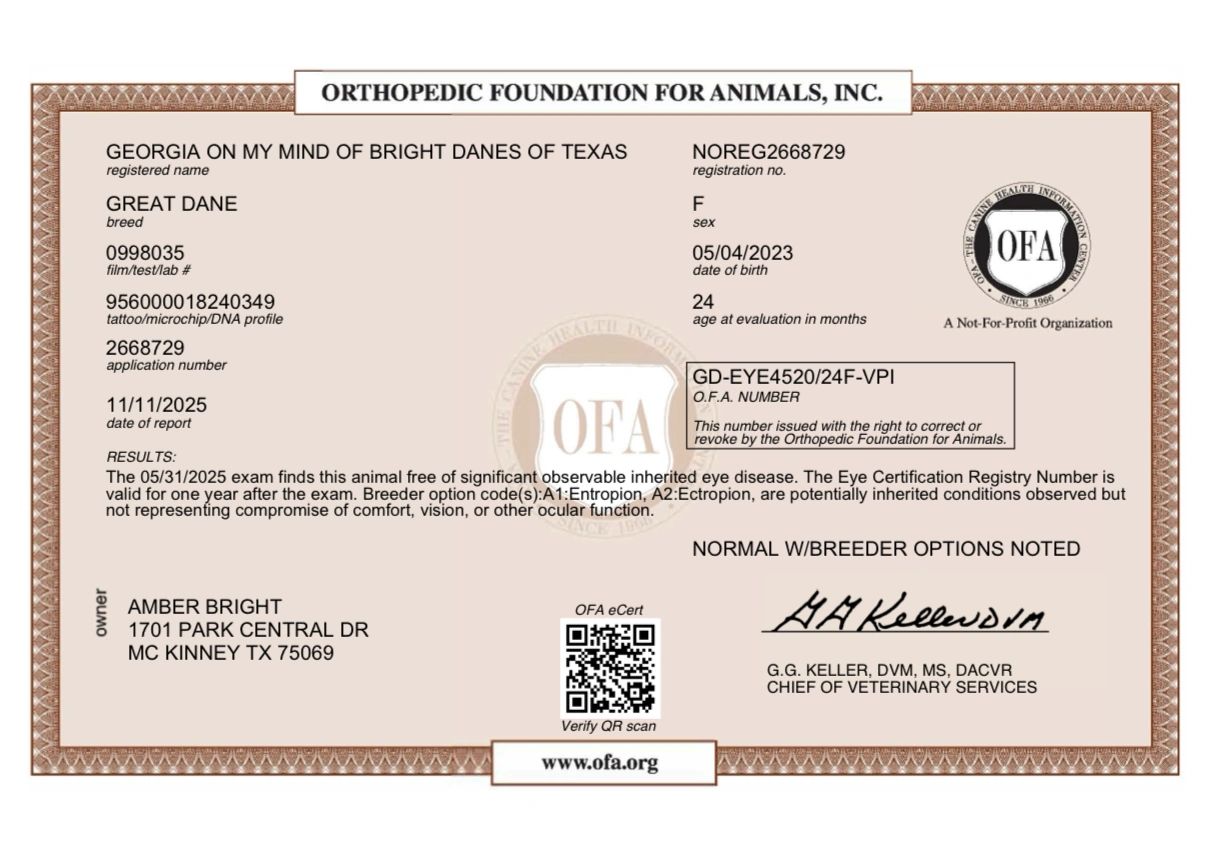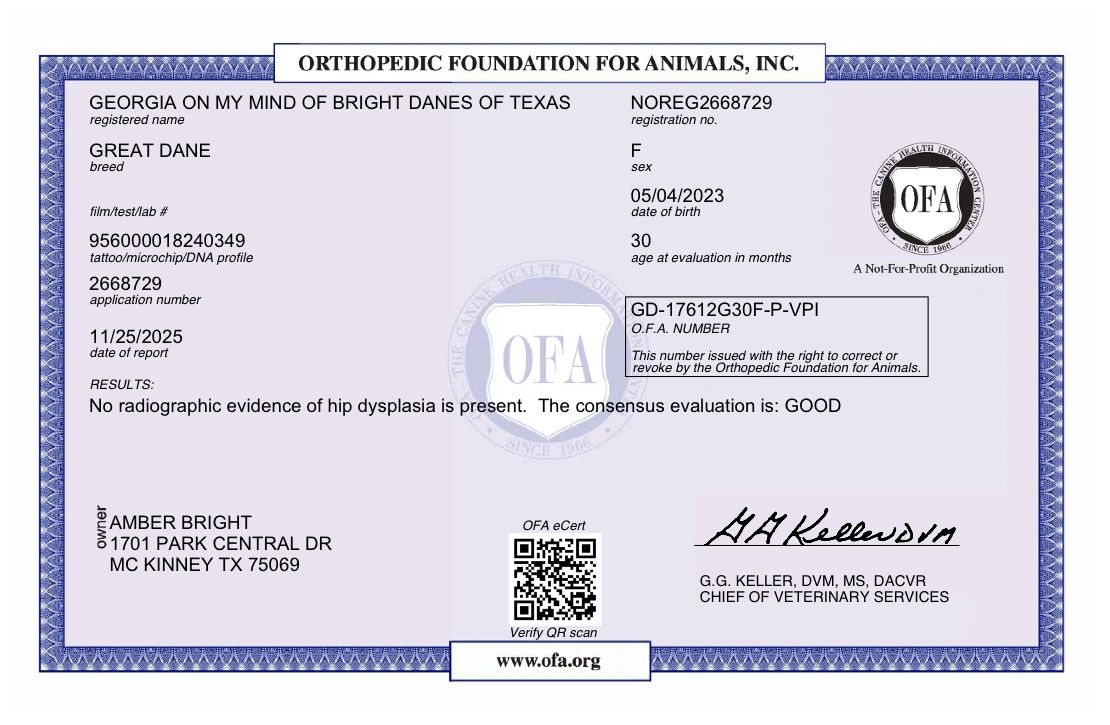 Bright Danes of Texas Genetic and Health Testing: OFA, PennHip, and Embark